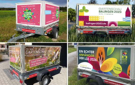 Unsere mobilen Anhänger sind wahre Hingucker – und das nicht ohne Grund! Bereits vier Gartenschauen vertrauen auf unsere mobile Anhängerwerbung: Landesgartenschau Überlingen 2021, Gartenschau Balingen 2023, Gartenschau Freudenstadt–Baiersbronn 2025 und Landesgartenschau Ellwangen an der Jagst 2026 Jetzt Werbetrommel rühren und Ihre Botschaft ins Rollen bringen! Ob Event, Produkt oder Kampagne – wir sorgen dafür, dass Ihre Werbung mobil bleibt und Eindruck hinterlässt – sichtbar, flexibel und wirkungsvoll.
