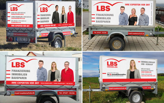 Seit über 15 Jahren begleiten wir die LBS mit unserer Anhängerwerbung – zuverlässig, regional und sichtbar. Auch 2026 setzt die LBS auf aufmerksamkeitsstarke Anhängerplanen, die rund um die Filialen für Präsenz und zusätzliche Bekanntheit des Teams sorgen. Wir schätzen das langjährige Vertrauen und freuen uns über die kontinuierliche Zusammenarbeit.